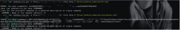 java -jar jenkins-cli.jar -s http://localhost:8080/ -http help 1 "@/var/jenkins_home/secret.key" java -jar jenkins-cli.jar -s http://localhost:8080/ -http help 1 "@/var/jenkins_home/secrets/master.key"