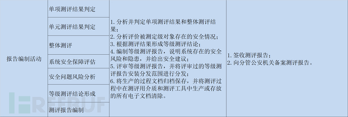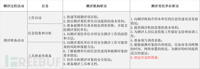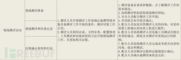 | 方案编制活动 | 测评对象确定 | 1.详细分析被测定级对象的整体结构、边界、网络区域、设备部署情况等; 2.初步判断定级对象的安全薄弱点; 3.分析确定测评对象、测评指标、测评内容和工具测试方法; 4.编制测评方案文本,并评审; 5.制定风险规避实施方案。 | 1.为测评机构完成测评方案提供信息和资料; 2.评审和确认测评实施方案文本; 3.评审和确认测评机构提供的风险规避实施方案。 4.若不在生产环境开展测评,则配置和生产环境各项安全配置相同的备份环境、生产验证环境或测试环境作为测试环境。 |