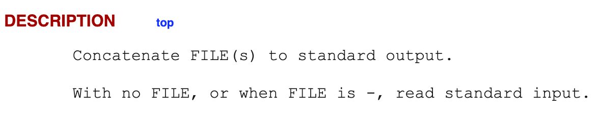 Perfect! It's all making sense now. Since - is treated as a signal to read from stdin, cat interprets it that way. To ensure it treats - as a filename instead, you need to provide its absolute path, either using realpath or by prefixing it with $PWD.
