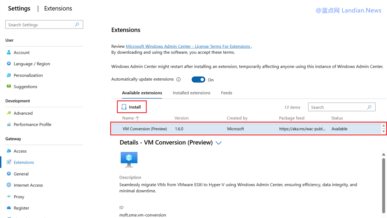 这个新的 VM 转换实用程序并非单独提供,而是以 Windows Admin Center 扩展模块形式提供,因此只有企业 IT 管理员才可以使用这个实用程序执行转换和迁移。