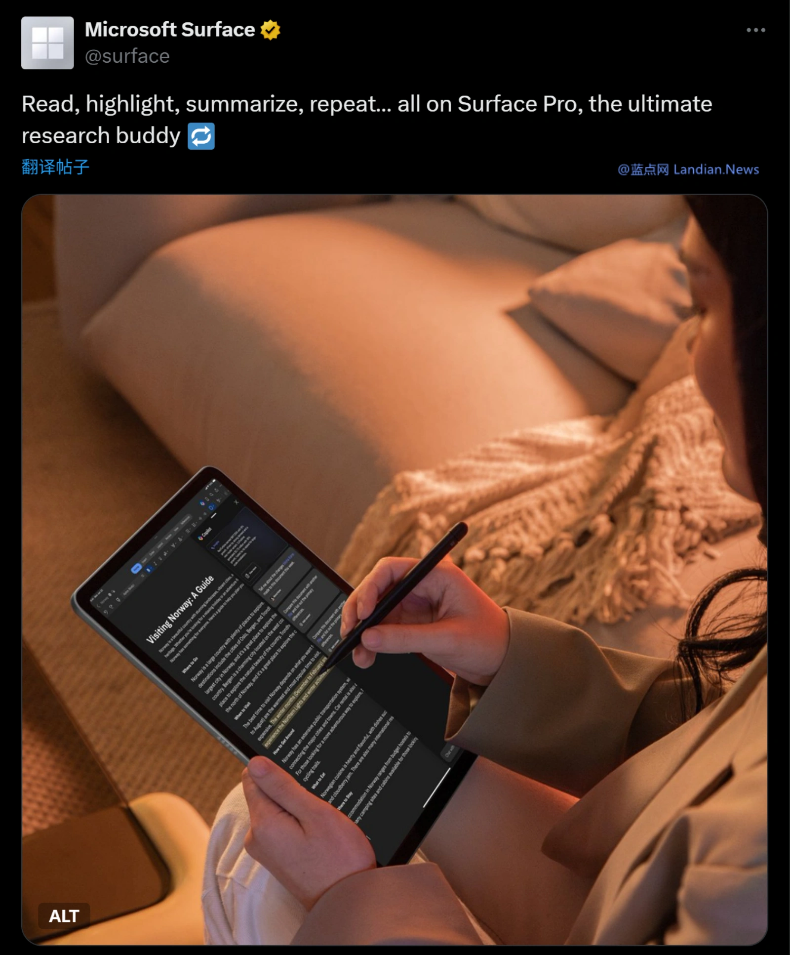 微软官方认证账号 X@Microsoft Surface 在 2025 年 9 月 7 日 12 点发布宣传海报,这张宣传海报的配文是突出 Surface 平板电脑提供的功能,让用户可以在 Surface 上阅读、突出显示、总结等。
