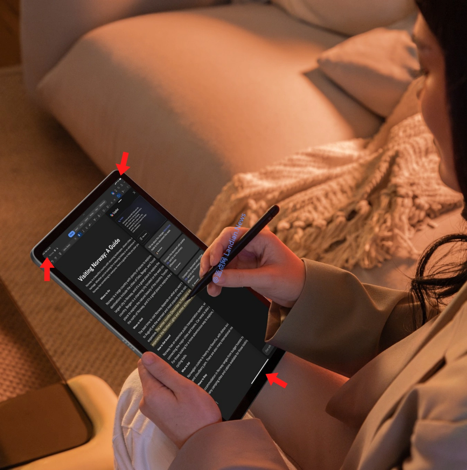 从设备图片的顶部左右侧以及底部都可以看出来这就是 iPadOS,毕竟 Surface 是没法运行 iPadOS 的,所以显然这不是微软自己制作的模特摆拍照片,而是拼凑而来的。