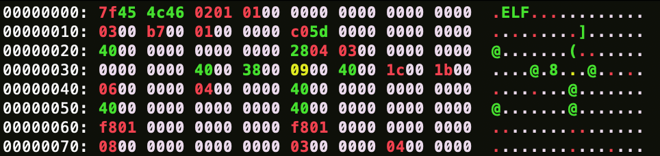 /bin/lsThe xxd command will print the entire contents of the file and convert each byte to its character representation. If that character is in the range of human-readable characters, it will display the hex code in green; otherwise, it will display the read colour, and null characters will be shown in white.