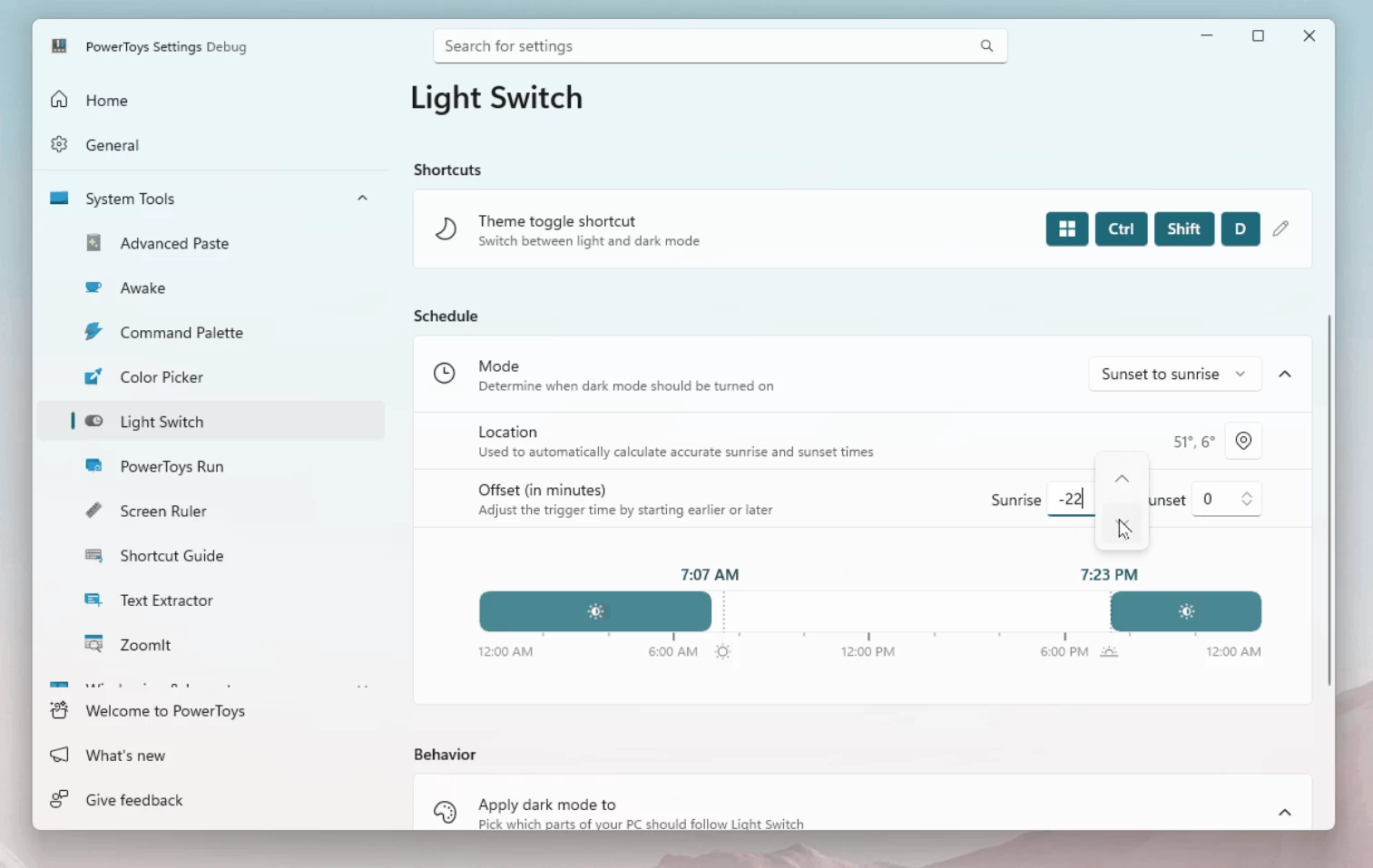考虑到用户没有必要日落后就立即切换到深色模式,PowerToys 还提供偏移时间选项,例如在日落后第 2 个小时再切换到深色模式,或在日出前 1 个小时切换到浅色模式等等。