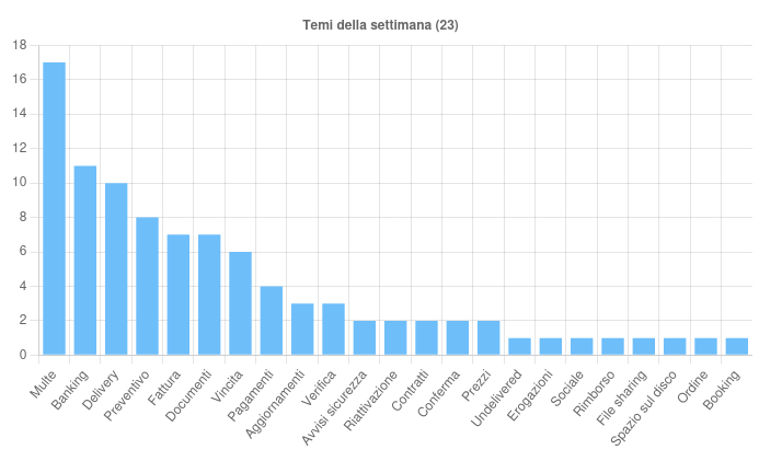 La scorsa settimana sono stati individuati 23 temi, sfruttati per diffondere campagne malevole in Italia.