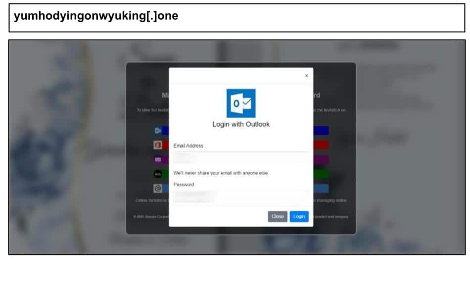 This one uses an online invite lure (eg. Paperless Post, Greenvelope etc.) to “view the invitation”. Similar to others of this type, it offers the user multiple login options and a fake MFA flow.