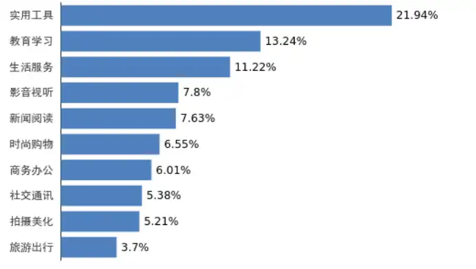 从APP类型来看,实用工具类APP存在漏洞风险最多,占漏洞APP总量的21.94%,其次为教育学习类APP,占比13.24%,生活服务类APP位居第三,占比11.22%,漏洞数量排名前十的类型如下图所示: