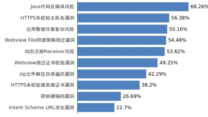 针对不同类型的漏洞进行统计,应用中高危漏洞数量排名前三的类型分别为Java代码反编译风险、HTTPS未校验主机名漏洞以及应用数据任意备份风险。各漏洞类型占比情况如下图所示: