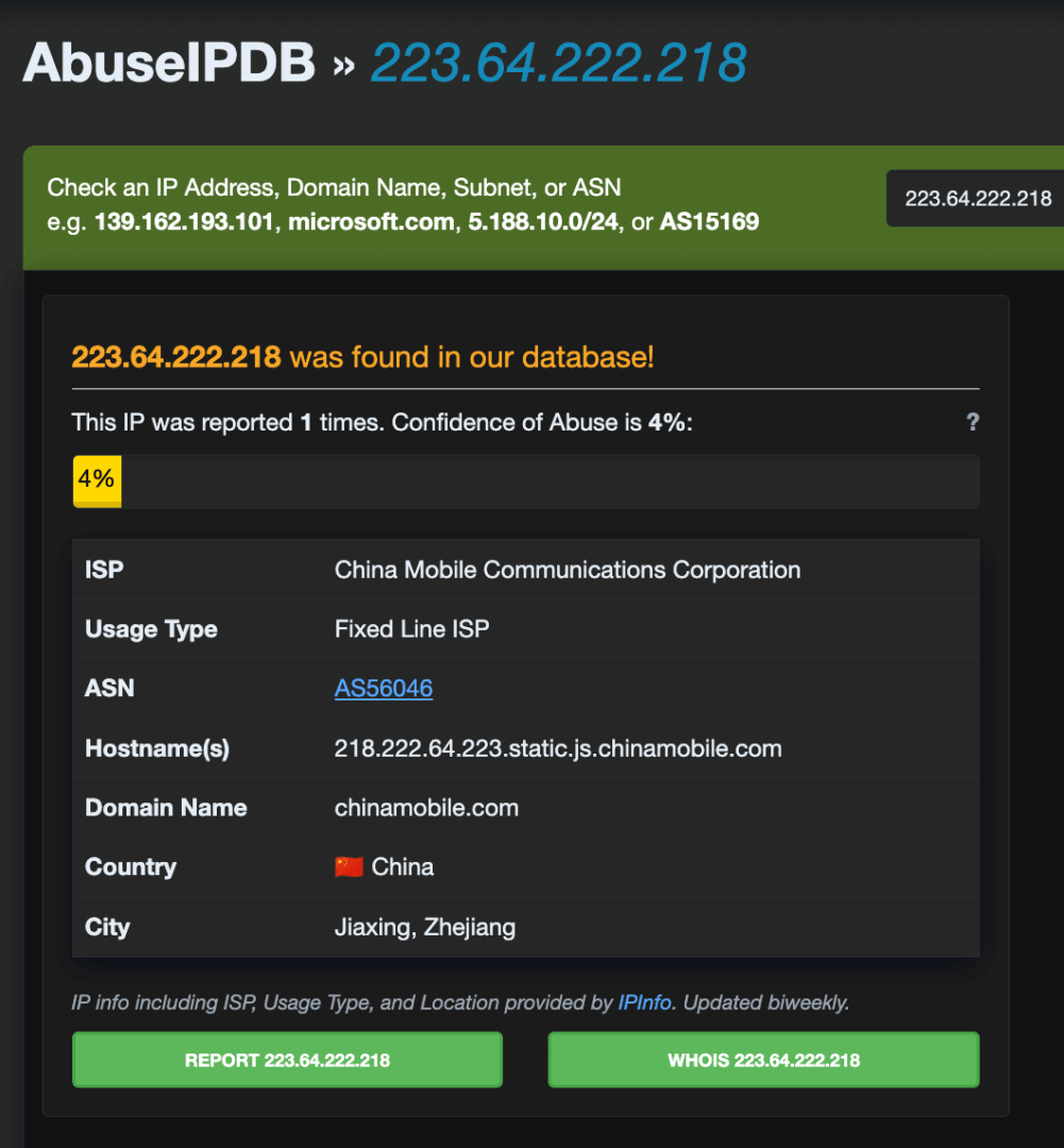 Analizzando gli IP attaccanti, abbiamo scoperto che tanti di essi non erano ancora stati segnalati in GreyNoise o flaggati come malicious su AbuseIPDB, piattaforme leader nel monitoraggio delle attività di scansione su Internet: