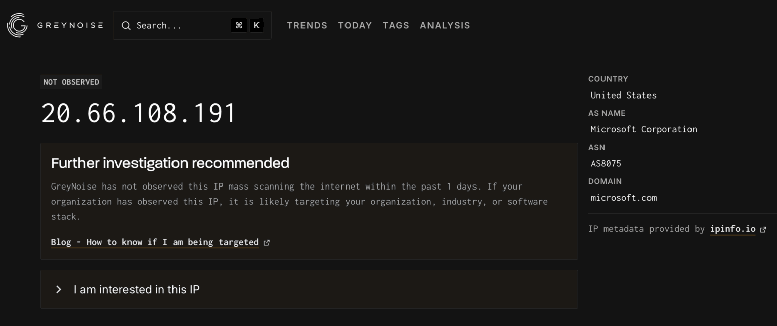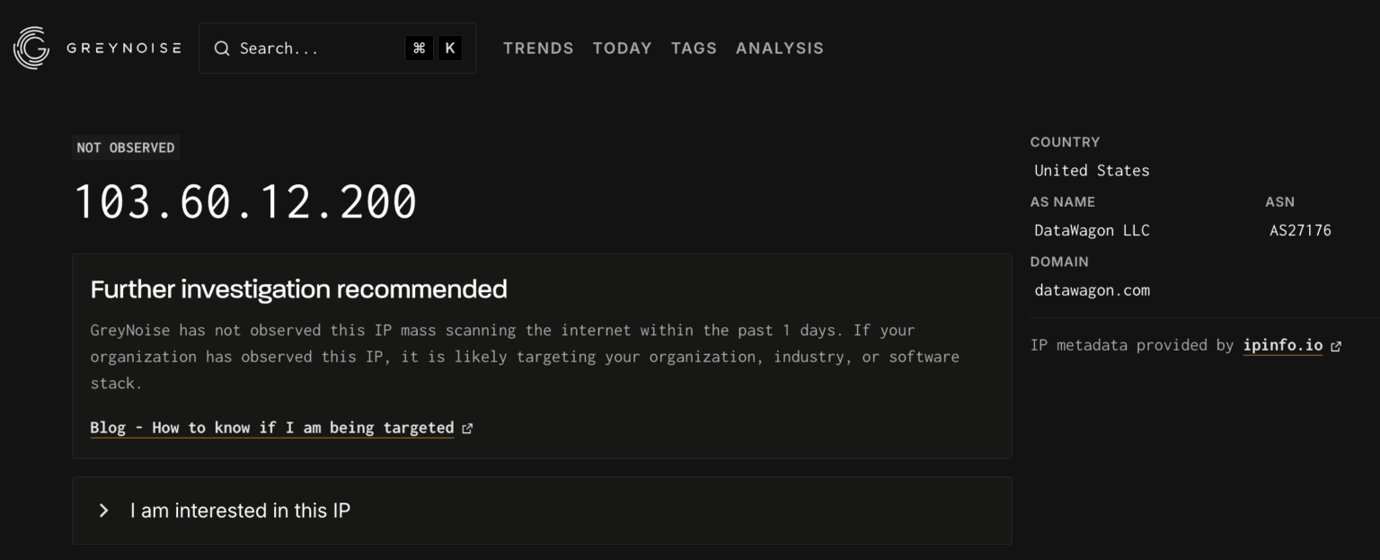 Questo dimostra un vantaggio chiave della threat intelligence basata su honeypot, scoprire attaccanti ed indirizzi IP malevoli prima che compaiano nei database pubblici, fornendo avvisi preventivi prima che gli aggressori compromettano i sistemi di produzione.