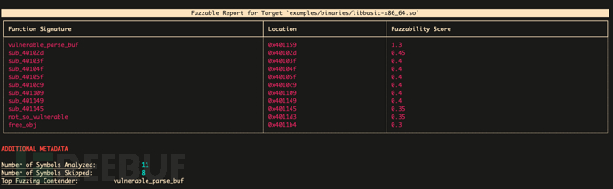 # 分析一个单独的共享对象库代码 $ fuzzable analyze examples/binaries/libbasic.so # 分析一个单独的C源代码文件 $ fuzzable analyze examples/source/libbasic.c # 分析一个包含多个C/C++文件和头文件的工作空间 $ fuzzable analyze examples/source/source_bundle/