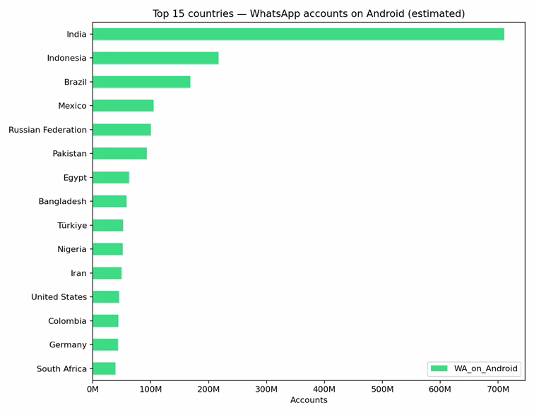 This analysis is based on country-level data from the WhatsApp Census research project by SBA Research. The dataset originates from metadata published in connection with a security study titled “Trivial WhatsApp Security Issue Exposed 3.5 Billion Phone Numbers.” That research demonstrated how a simple flaw could reveal phone numbers globally. Using the anonymized metadata from that disclosure, I compiled statistics on WhatsApp adoption, penetration, OS market share, Business account share and some unexpected findings across more than 230 countries and territories.
