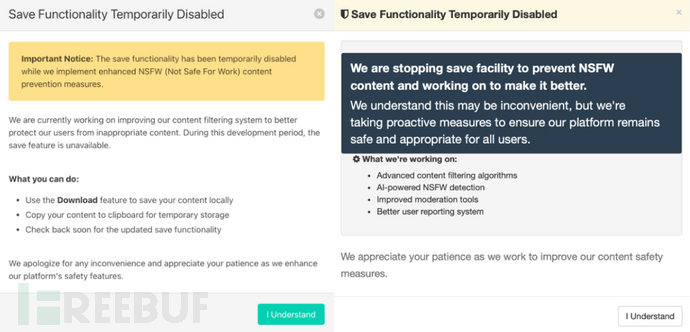 经The Hacker News核实,JSONFormatter和CodeBeautify已暂时禁用保存功能,声称正在"改进该功能"并实施"强化的NSFW(工作场所不安全)内容防护措施"。watchTowr表示,网站禁用保存功能很可能是对研究结果的回应,并推测该变更发生在9月,是对其向受影响组织发出警告后的反应。