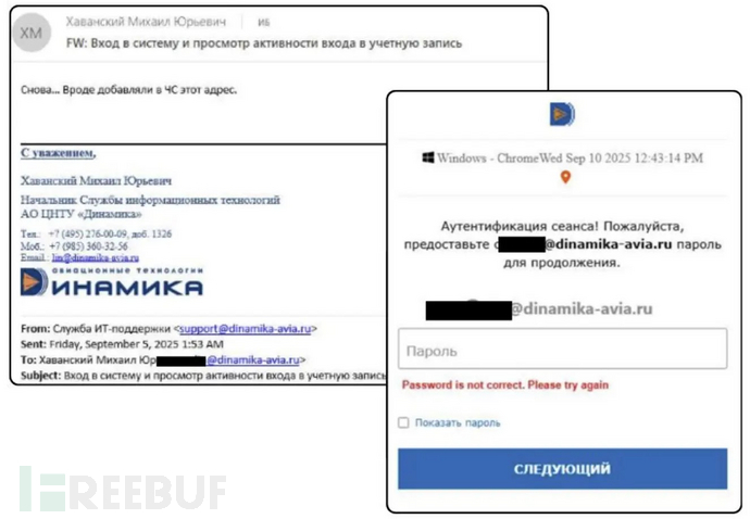 钓鱼邮件内容(左)与钓鱼页面(右)(来源:Intrinsec)