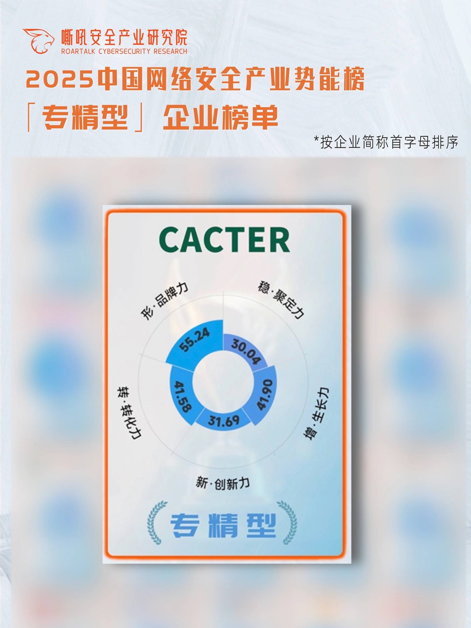 近日,国内网络安全领域权威研究机构嘶吼安全产业研究院正式发布《嘶吼2025中国网络安全产业势能榜》。CACTER凭借大模型+安全的持续创新及广泛行业影响力,成功入选「专精型企业」榜单,并同步斩获“声量品牌力”企业专项荣誉,实现“双榜加冕”。