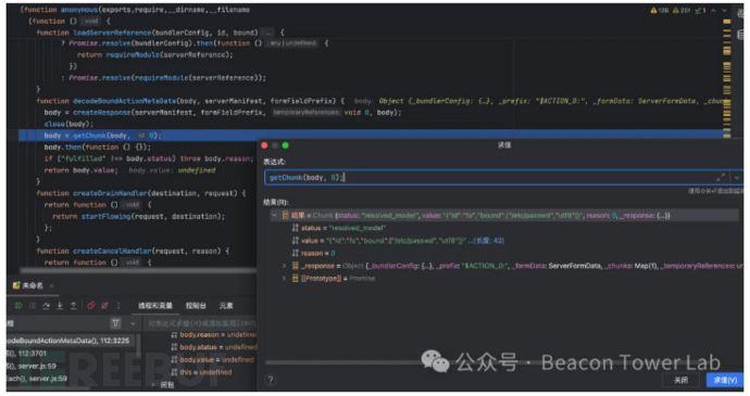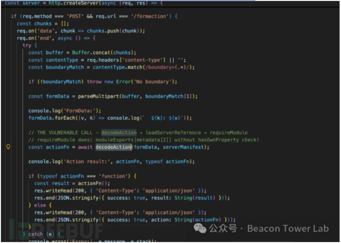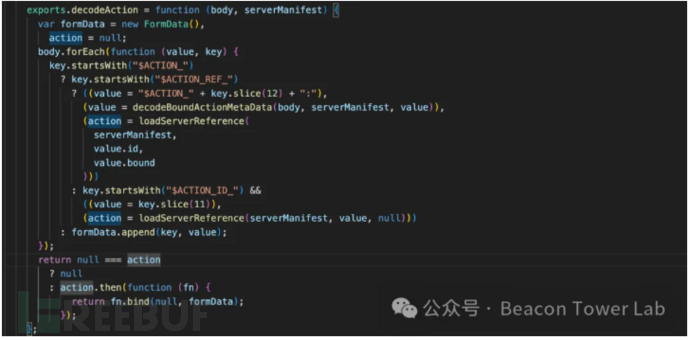 注释很明显,主要关注decodeAction函数,decodeAction函数的实现位于node_modules/react-server-dom-webpack/cjs/react-server-dom-webpack-server.node.development.js中,接收body和serverManifest。当表单名以$ACTION_REF_123 开头,则截取$ACTION_REF_123 中的123,然后重新拼接为$ACTION_123: 作为value,然后将body、serverManifest、value作为参数调用decodeBoundActionMetaData方法。