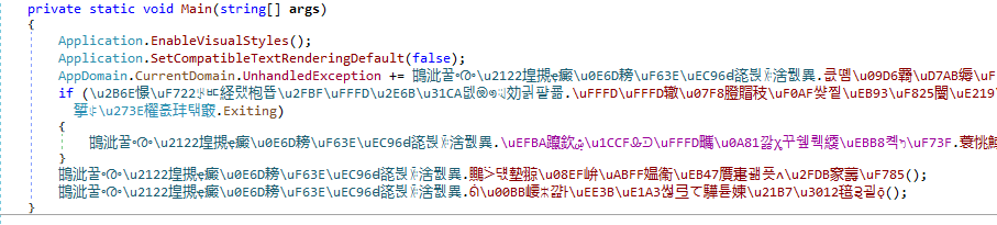 This build employs a generic .NET obfuscator, many tools are available on GitHub such as .NET-Obfuscator, obfuscar. A quick inspection in dnSpy confirms significant obfuscation.