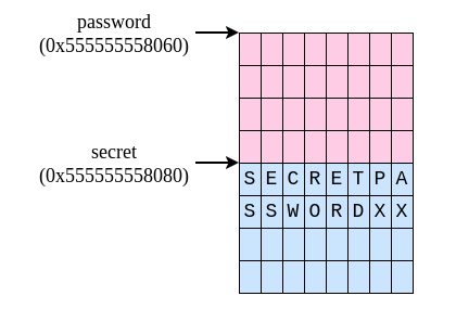 (gdb) x/1s &password 0x555555558040 <password>: 'A' <repeats 40 times> (gdb) x/1s &secret 0x555555558060 <secret>: "AAAAAAAA"