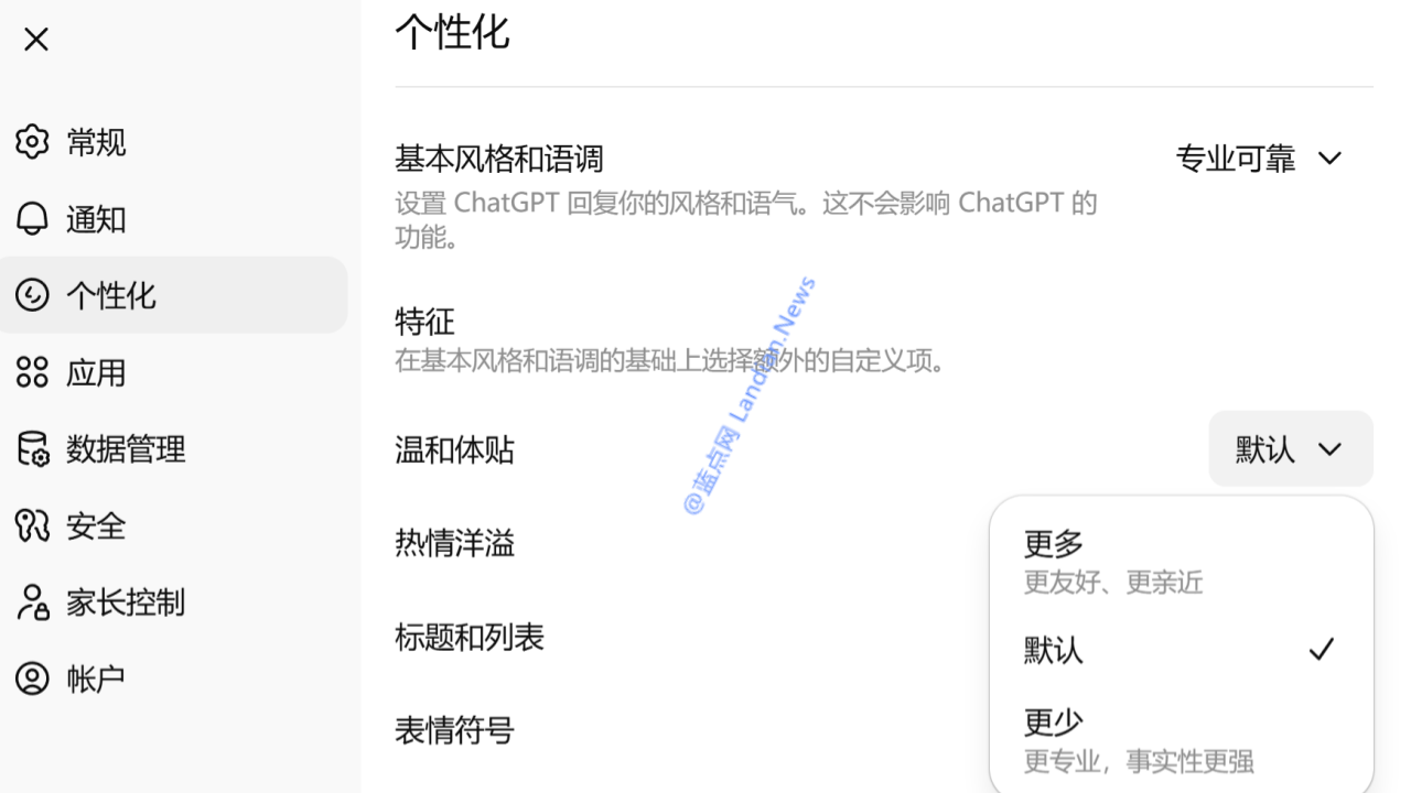 ChatGPT现在可以由用户主动调整热情程度 例如更加温和体贴或减少/增加使用表情符号