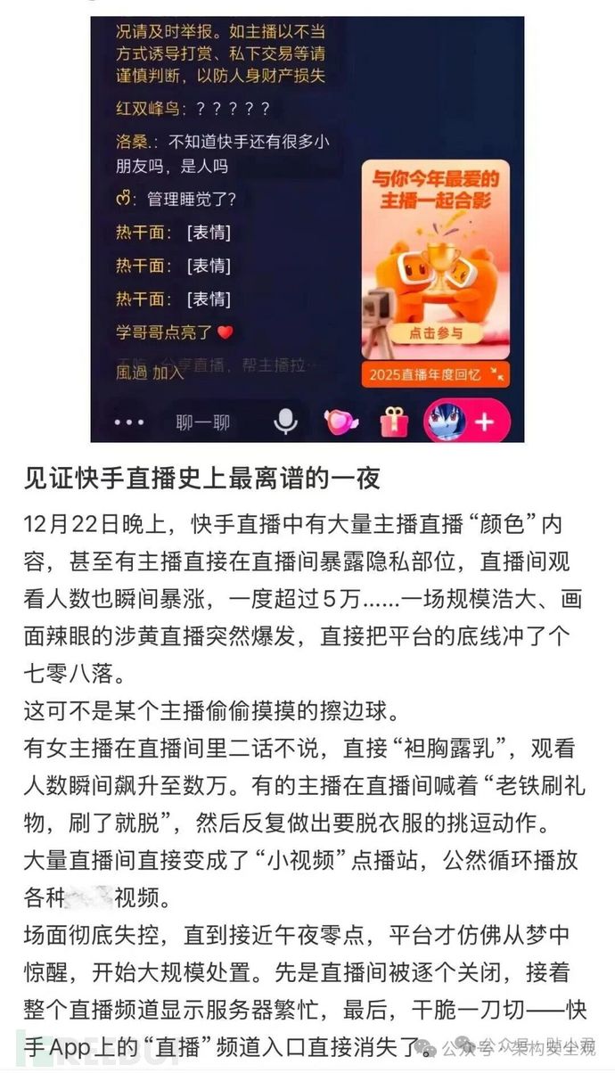 但 12·22 事件呈现出的特征是:多个直播间同时异常,内容呈“集中爆发态”,平台需要整体处置与兜底,这更像是一次系统在异常流量冲击下的整体失效。