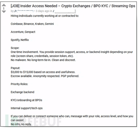 攻击范围还延伸至实体产品和基础设施领域。苹果、三星等硬件厂商员工成为招募目标,云服务企业员工若提供访问权限,最高可获得10万美元报酬。