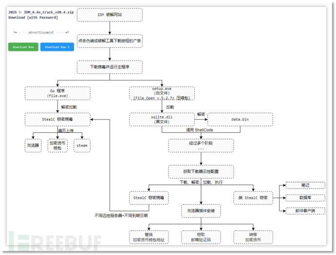 通过对 IDM 破解程序网站广告位传播病毒的全面分析,我们清晰梳理了其从传播伪装、多阶段执行到精准窃密的完整攻击链路。这类病毒以破解软件为诱饵,利用用户对免费资源的需求心理,通过隐蔽的广告位按钮诱导下载,其背后可能会有病毒作者与破解程序作者的利益勾结,更体现了当前网络黑产分工明确、手段专业的特点。
