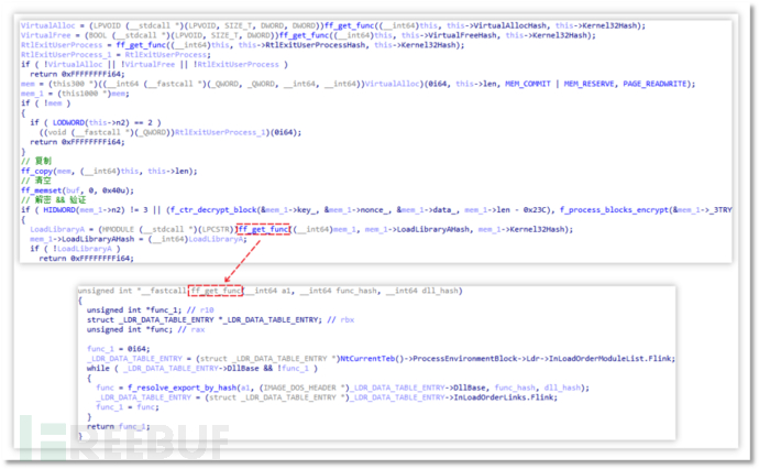 该模块中通过 PEB 的模块枚举并利用动态链接库名称与函数名称的哈希计算获取到匹配的函数地址,例如 VirtualAlloc、VirtualFree、RtlExitUserProcess、LoadLibraryA 等函数,随后通过解密算法解密偏移 0x23C 处的加密数据。