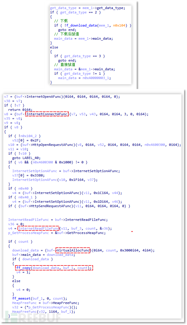 获取数据的方式存在三种标记,分别为 1、2、3,它们依次对应直接赋值(数据中已存在)、下载数据以及直接退出程序(即不获取数据)。在此过程中,数据将通过系统函数(RtlDecompressBuffer)或自行实现的解压函数进行解压处理。