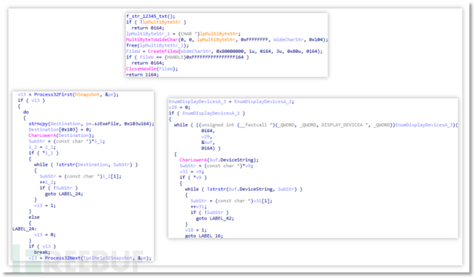 该阶段开始会检测当前目录下 12345.txt 文件是否存在、检测危险进程是否存在、检测虚拟显卡是否存在。