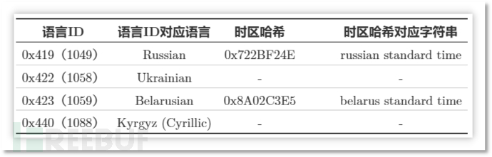 该阶段会先检查语言ID与时区,若语言ID或时区与下表吻合则终止当前进程。