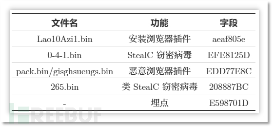 下图展示了不同字段值所对应不同链接下载得到的文件功能。例如其中的 Lao10Azi1.bin 文件,经解密后为用于安装浏览器插件的功能模块。