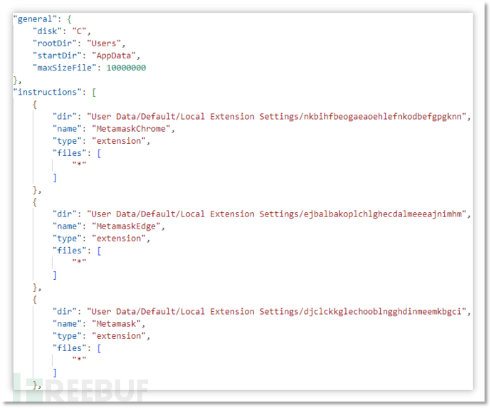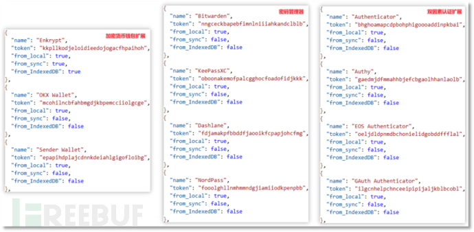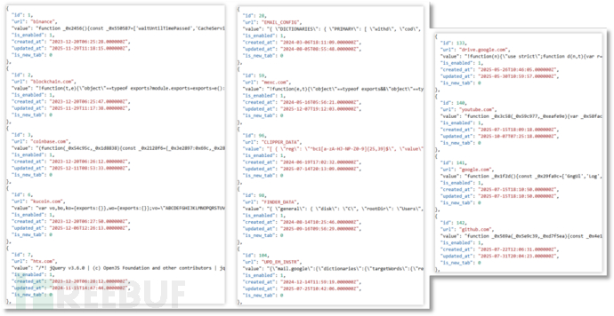 浏览器插件可通过 https://quick-neo.com/api/machine/injections?uuid={uuid} 获取窃密云控配置,下面是部分配置中的内容: