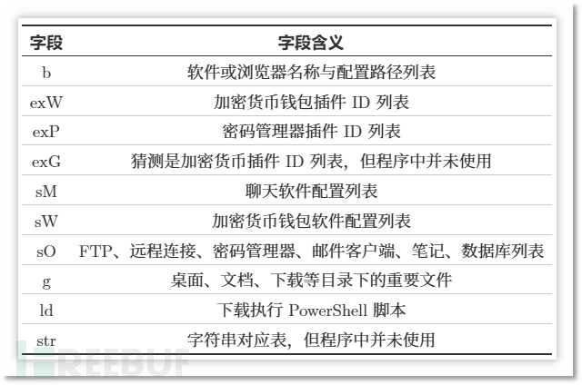 下图是字段含义表,其中涵盖了各类软件的窃密配置,诸如各种浏览器、加密货币钱包、密码管理器、聊天软件、FTP 以及邮件客户端等,甚至还包含用户笔记的数据,例如 Windows 系统中的便笺(Sticky Notes)数据。