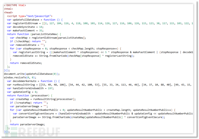 下载的是 html,其中嵌入了 script 脚本。其中 updateFullDatabase 和 decodeWorkerAuto 函数为字符串提取函数。