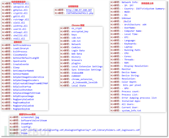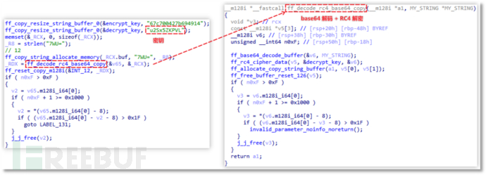 解密字符串:首先会利用 Base64 和 RC4 算法解密被加密字符串,其中 RC4 算法密钥为 u2Sx5ZKPVL。