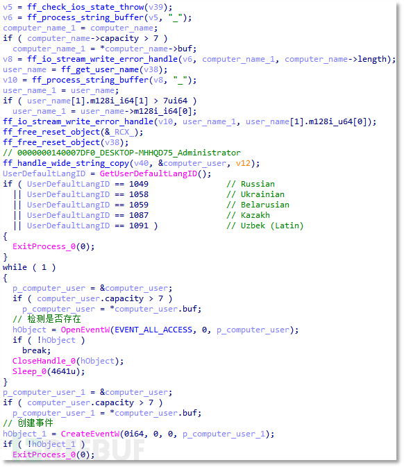 随后,借助 GetUserDefaultLangID 函数来判断当前区域的语言是否为俄语、乌克兰语、白俄罗斯语、哈萨克语、乌兹别克语等。若符合其中任意一种,进程将即刻退出。之后,通过函数地址、计算机名以及用户名组合成事件名,并尝试对其进行打开或者创建操作,以此确保仅有一个进程处于运行状态。