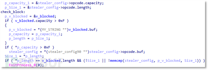 被封禁则终止进程:如果被远控服务器检查到了异常则可能会被封禁,此时返回的数据包则是 {"5dabacxxx53bf03":"8f9eeaxxx12ca","opcode":"blocked"},接收数据包后在代码中判断 opcode 是否为 blocked,若为 blocked 则会利用 ExitProcess 函数退出进程。