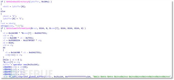 其中用户唯一标识是通过 GetWindowsDirectoryA 与 GetVolumeInformationA 分别获取系统根目录和获取盘符序列号,并通过计算生成用户唯一标识(格式: XXXXXXXX-XXXX-XXXX-XXXX-XXXXXXXXXXXX)。