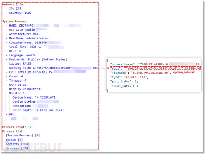 发送系统信息:随后将这些数据如下图左边格式保存,并以下图右边格式发送至远程服务器中,发送时将以下系统信息放到 JSON 数据中 data 字段,将 filename 字段值设置为 system_info.txt 的 Base64 编码格式,表示此次发送的是系统信息。