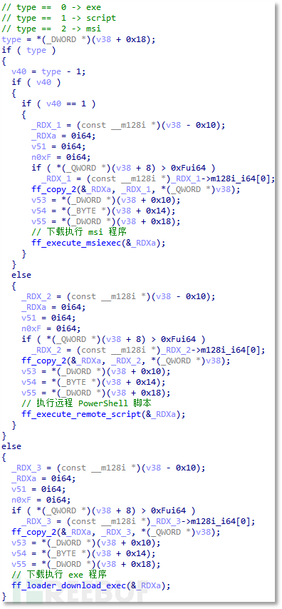 窃密配置中有一个比较特殊的字段 loader,发现该字段为 0 或 1 都会执行,区别是 0 时会在窃密结束前运行,1 时会在窃密初期运行。