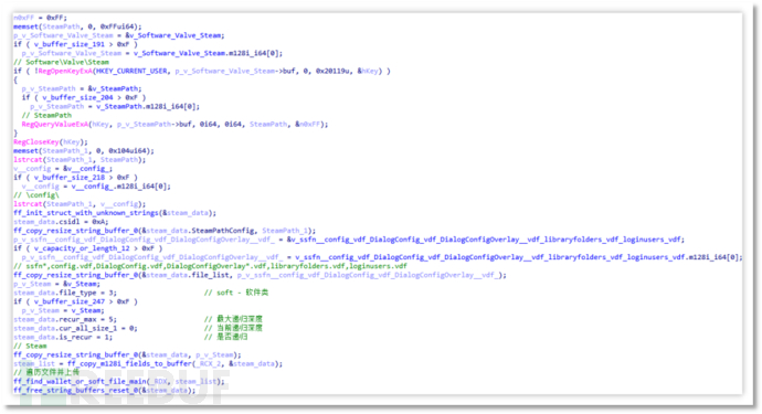 遍历 Steam 平台配置文件并上传:Steam数据的窃取被编写于窃密模块之中,该模块会借助注册表查找Steam路径,而后依据文件名列表实施上传操作。待上传的文件分别为ssfn*、config.vdf、DialogConfig.vdf、DialogConfigOverlay*.vdf、libraryfolders.vdf、loginusers.vdf。其中,ssfn文件属于旧版Steam所生成的令牌授权文件。当此文件存在时,登录账号不会触发Steam Guard验证码,进而仅需账号与密码便可完成登录。然而,经调查发现,Steam已全面收紧Steam Guard校验机制,故而该方法基本已失效。