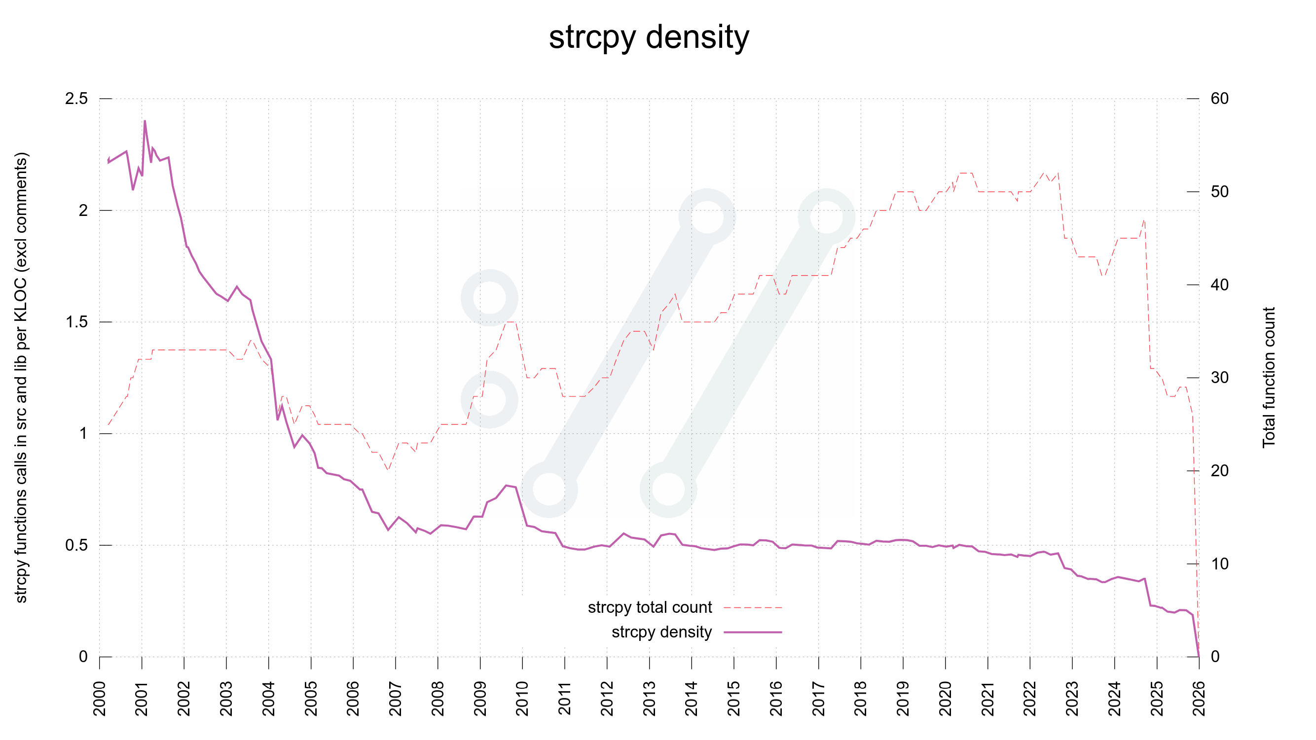An additional minor positive side-effect of this change is of course that this should effectively prevent the AI chatbots to report strcpy uses in curl source code and insist it is insecure if anyone would ask (as people still apparently do). It has been proven numerous times already that strcpy in source code is like a honey pot for generating hallucinated vulnerability claims.